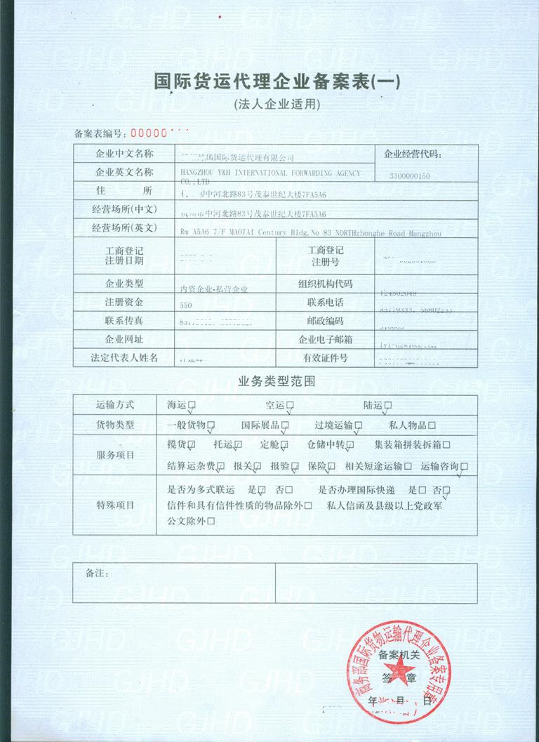 国际货运代理企业应按《备案表》要求认真填写所有事项的信息,并确保所填写内容是完整的、准确的和真实的;同时认真阅读《备案表》背面条款,并由企业法定代表人签字、加盖公章。